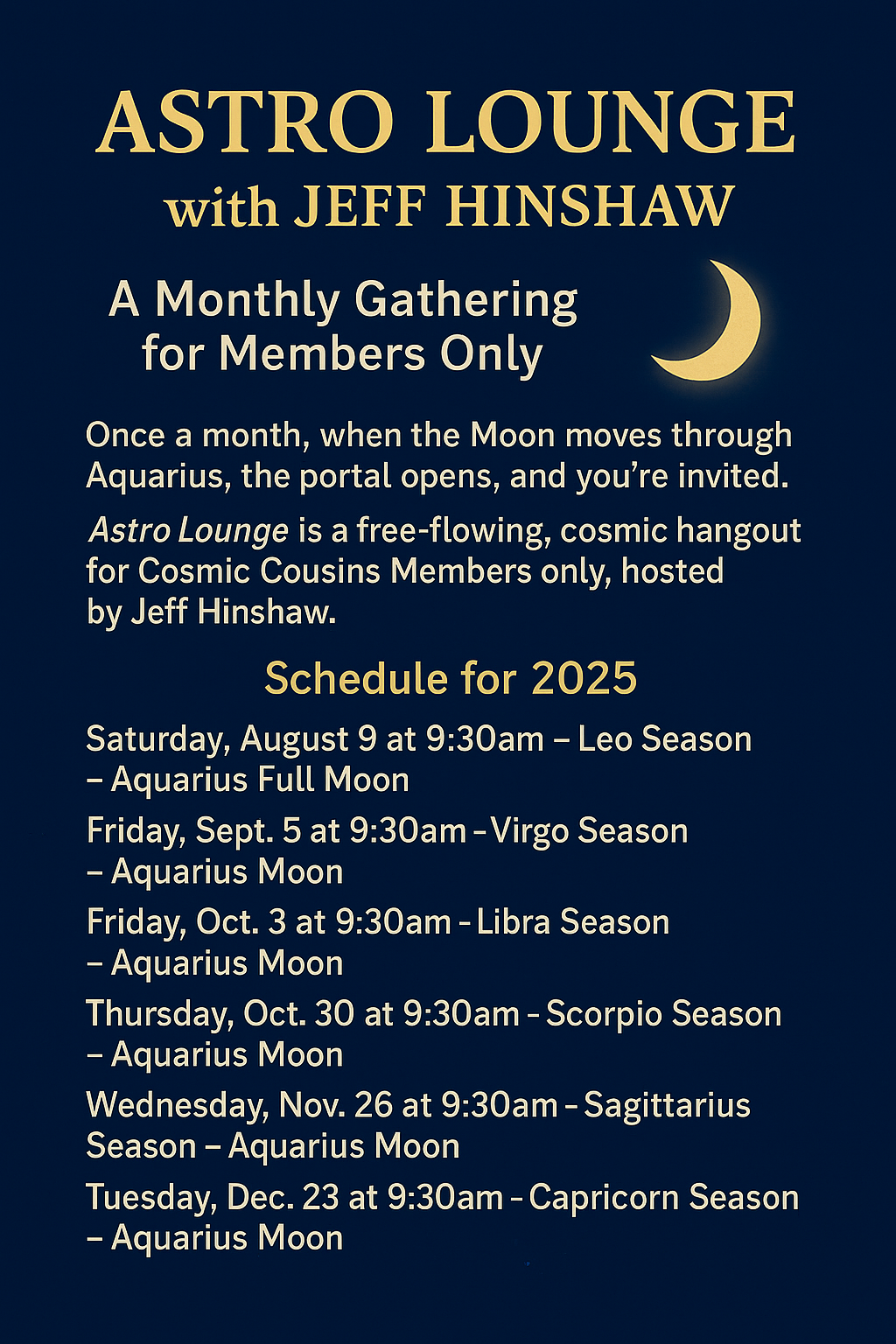 Once a month, when the Moon moves through Aquarius, the portal opens, and you’re invited. Astro Lounge is a free-flowing, cosmic hangout for Cosmic Cousins Members only, hosted by Jeff Hinshaw.