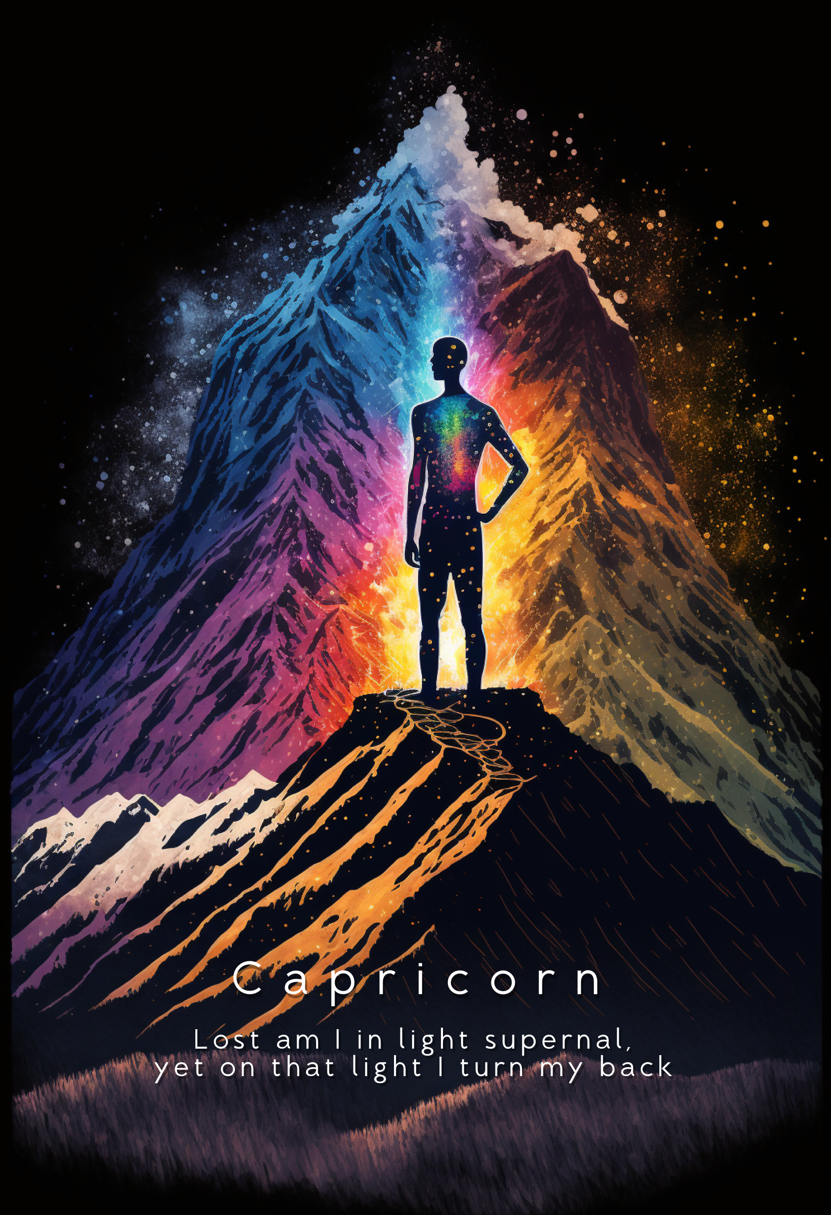 The Capricorn Esoteric Phrase card in the Cosmic Cousins Astro Oracle invites us to embark on a journey of soulful evolution. The esoteric phrase for Capricorn is "Lost am I in light eternal, yet on that light I turn my back." This phrase is open to interpretation and offers a meditation on Capricorn's growth, with the light representing source or enlightenment. Turning one's back signifies accepting the human experience and turning back to serve.