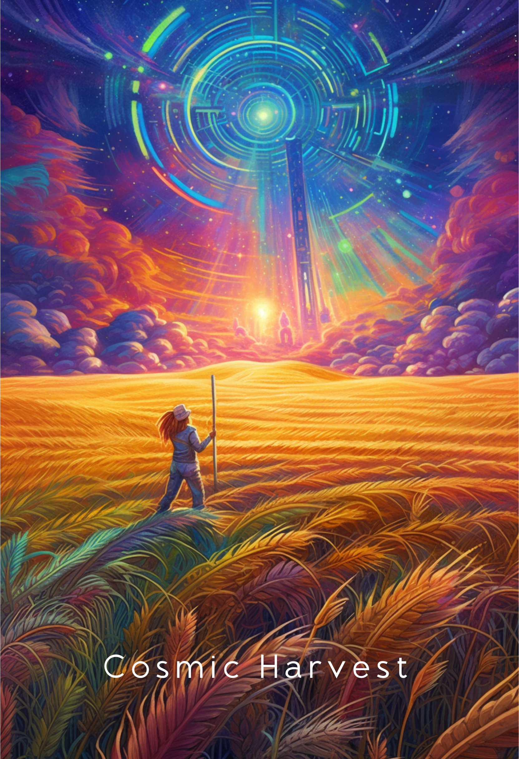 Here, by working and tending to the land, a cosmic harvester creates a mystical crop circle in the sky, connecting with both the earth and the cosmos. The harvester represents our ability to channel our energy and focus toward meaningful work and service. The crop circle is the sky symbolizes the conceptualization of systems and structures for greater efficiency and productivity for organizing our understanding of the Cosmos. This image deepens our understanding of the Cosmic Harvest card by reminding us of the importance of connecting with both the physical and spiritual realms in our pursuit of service and abundance.