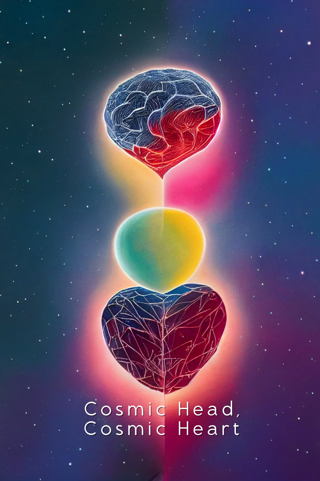 A cosmic head and cosmic heart float in the cosmos, interconnected and balanced. The cosmic head represents our capacity for logic, analysis, decision-making and cosmic understanding, while the cosmic heart represents our capacity for love, compassion, and emotional connection. This image symbolizes the need to integrate both aspects of ourselves, finding a harmony between intellect and emotion.