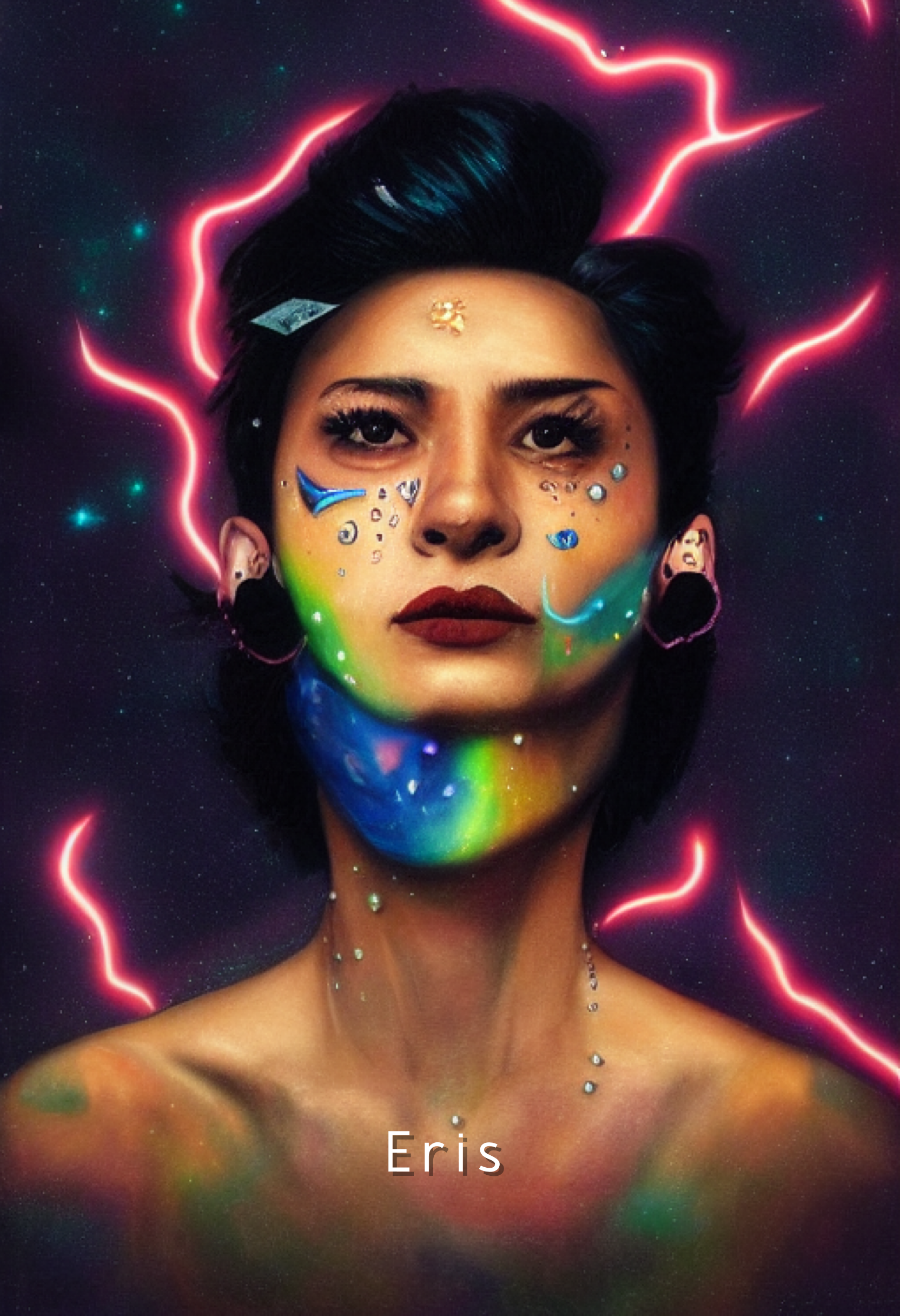 Somatic Embodiment: To deepen your exploration of Eris, you can engage in a somatic embodiment exercise. Take a moment to close your eyes, breathe deeply, and connect with your body. Visualize yourself standing tall, embodying the energy of rebellion and liberation. Feel the electric energy of the lightning coursing through your veins, igniting a fire within. Allow this energy to expand from your heart, radiating love, acceptance, and empowerment.