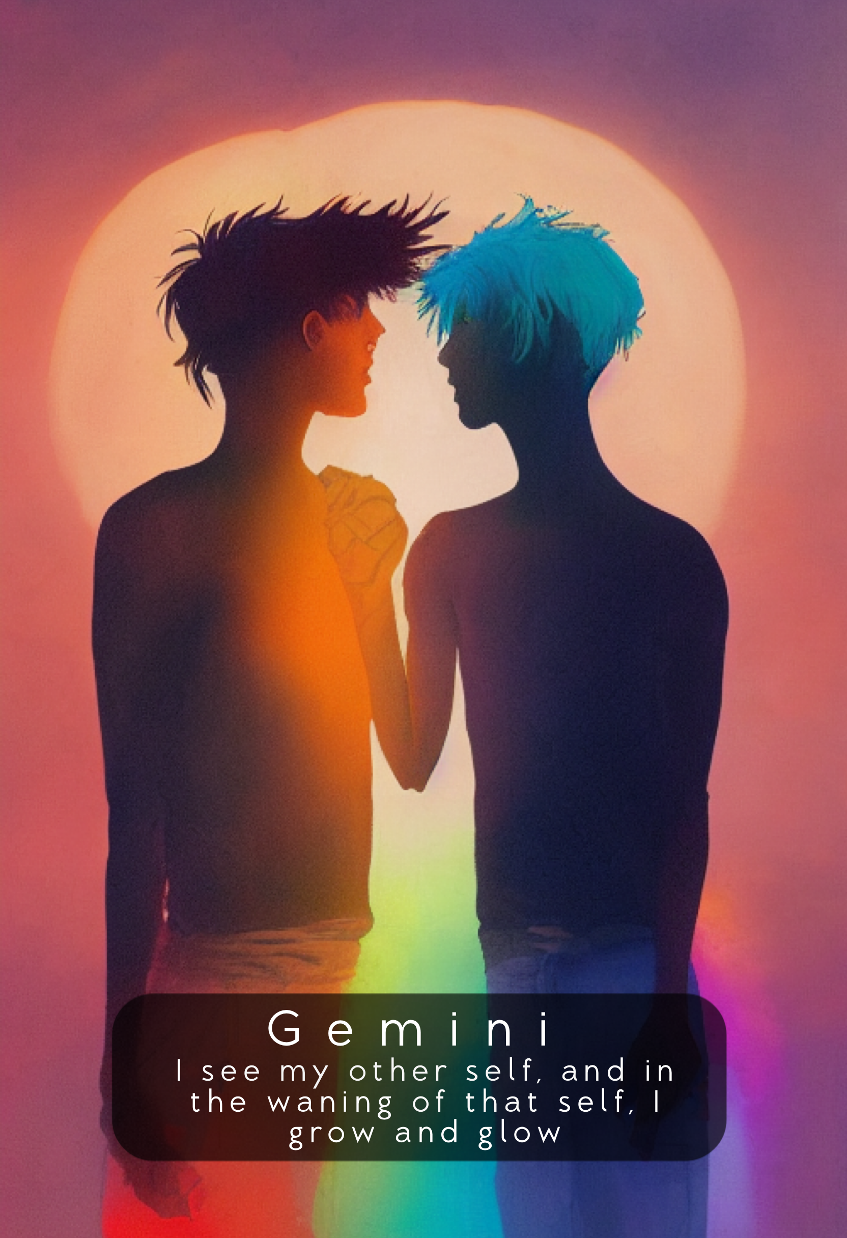 The Gemini Esoteric Phrase card in the Cosmic Cousins Astro Oracle invites us to contemplate the soulful evolution of this sign. The phrase, "I see my other self and in the waning of that self I grow and glow," is open to interpretation and offers a meditation on Gemini's spiritual growth.