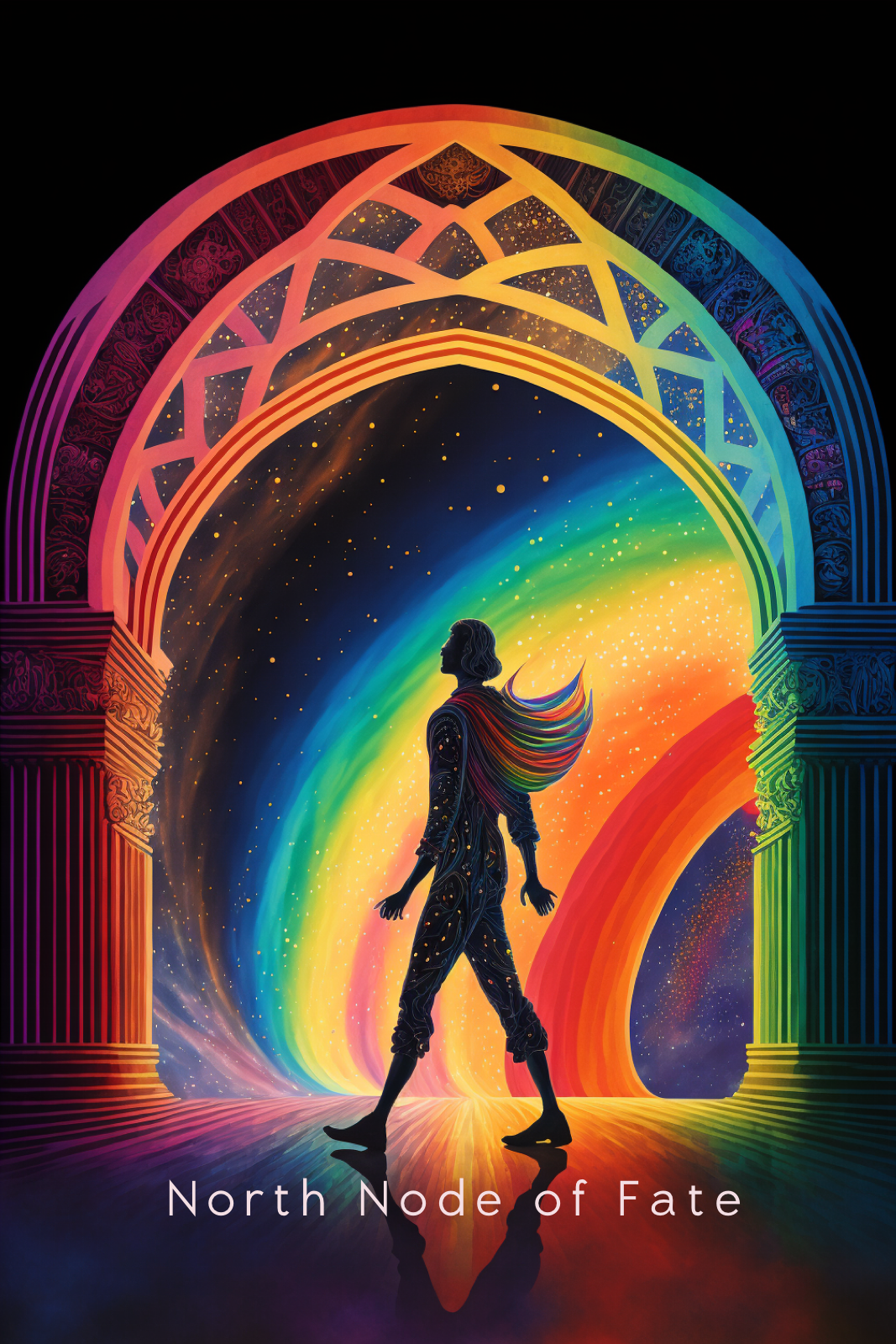 Image: The image of a hopeful cosmic traveler walking through an archway symbolizes the deeper meaning of the North Node of Fate. This image represents the journey of growth and transformation, stepping into new possibilities and opportunities. The archway signifies a passage or gateway to a new phase of the soul's evolution. The cosmic traveler represents the individual embarking on their path, filled with hope and anticipation for the lessons and growth that lie ahead.
