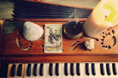 Here is a photo of the Knight of Cups on top of my harmonium. The Knight of Cups from an astrological perspective is connected to Cancer. Knights = Cardinal. Cups = Water. Mars will be in Cancer for the first two thirds of journey through the Major Arcana, encouraging us to embody the Knight of Cups – intuitive journeying.