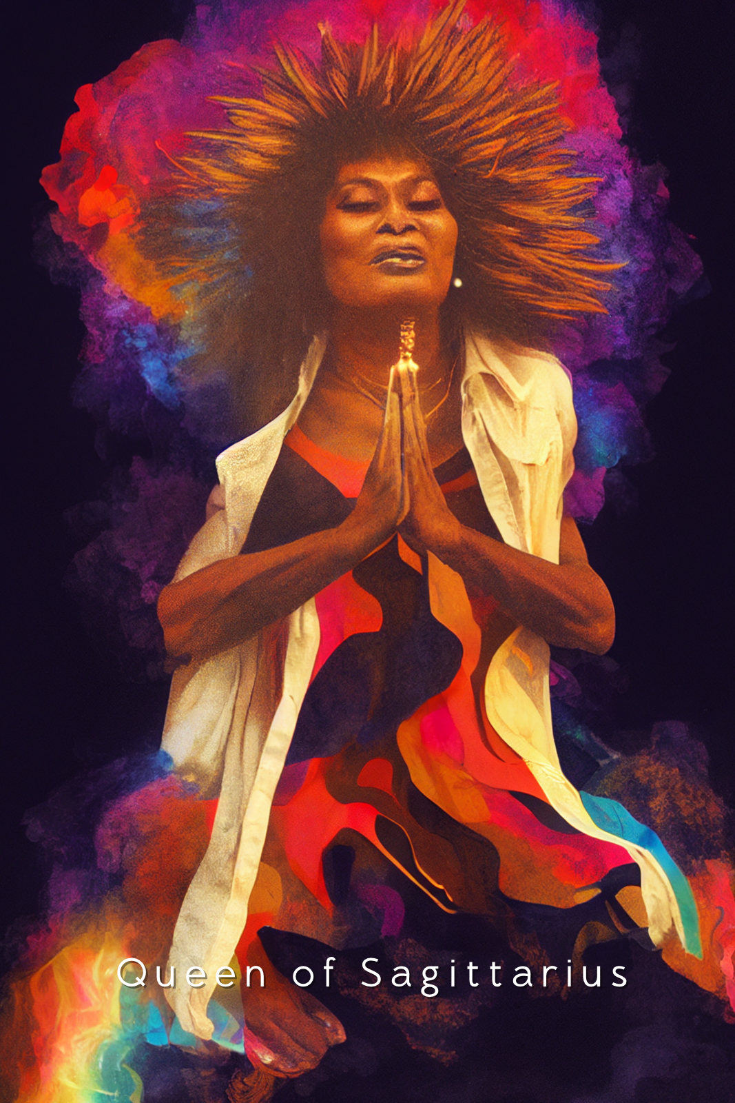 The Queen of Sagittarius card in the Cosmic Cousins Astro Oracle represents the energy and traits associated with the zodiac sign Sagittarius. This card embodies the essence of Sagittarius, which includes optimism, adventure, expansion, and a deep connection to spirituality. The Cosmic Cousins community has affectionately named Tina Turner as the Queen of Sagittarius due to her embodiment of these traits.