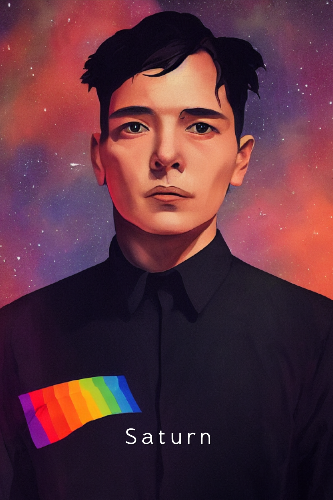Image: a stoic and serious androgynous person wearing all black, with a tiny rainbow stripe over their heart. The stoic and serious person embodies the resilience and strength cultivated through navigating life’s challenges. The choice to wear all black symbolizes the depth and introspection that comes with embracing the shadow aspects of oneself and confronting the difficulties of growth. The tiny rainbow stripe over their heart represents the resilience, authenticity, and pride that arise from embracing one's identity and work in the world, integrating it into one’s journey of maturity and responsibility.